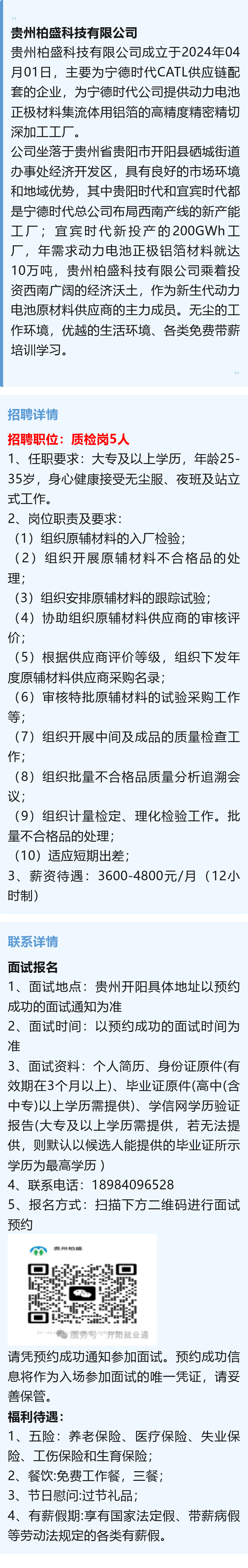【宁德时代CATL供应链配套企业】贵州柏盛科技有限公司招聘质检岗!