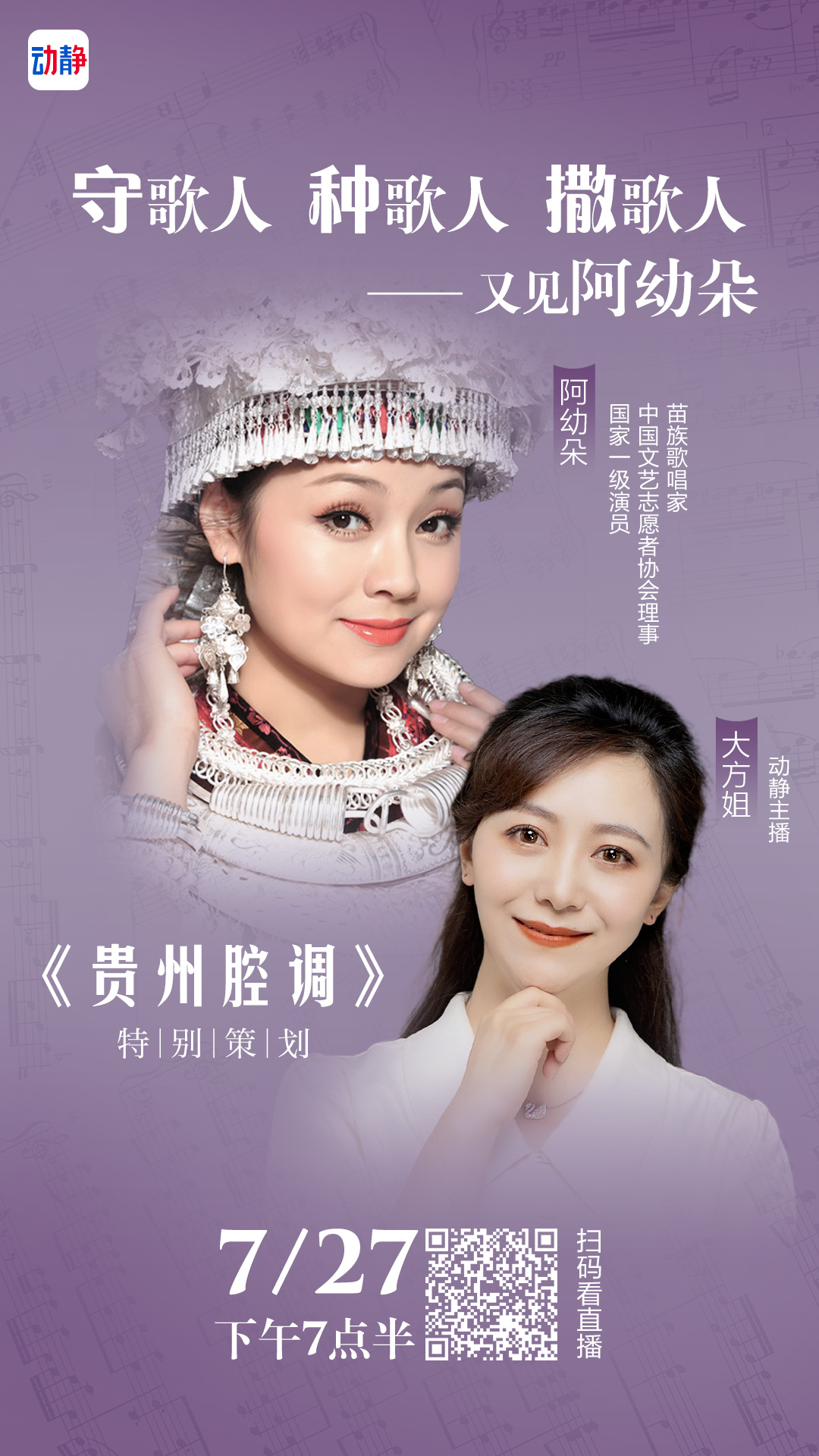 7月27日晚,苗族歌唱家、国家一级演员阿幼朵做客《贵州腔调》,同主持人大方姐一起用歌声解读贵州、讲述贵州、展示贵州。