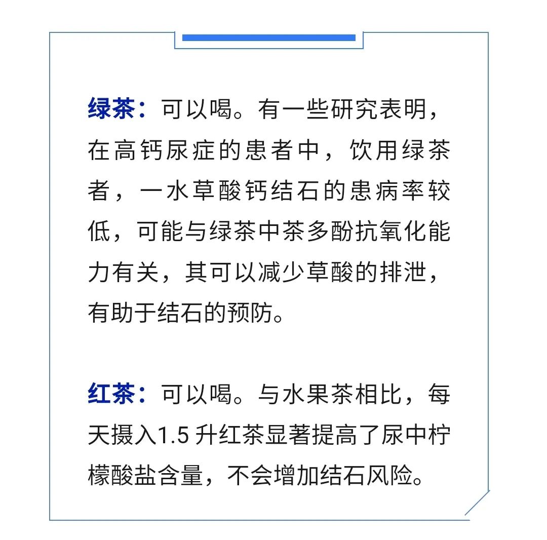 大部分患者都会被告知不宜饮茶,原因是茶类中富含草酸,会增加尿结石的产生。但最新的研究表明,这个说法可能不对的,适当喝茶有助于预防结石。