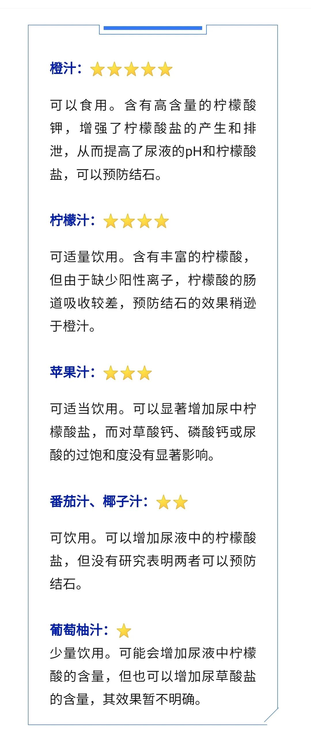 果汁太甜,肯定不行?其实不然!水果和蔬菜天然具有较高的柠檬酸盐含量,柠檬酸盐与尿液中的钙结合,减少尿液中的离子钙,降低钙盐的过饱和度。且柠檬酸盐可以抑制草酸钙和磷酸钙晶体的生长和聚集,可以预防结石生成。