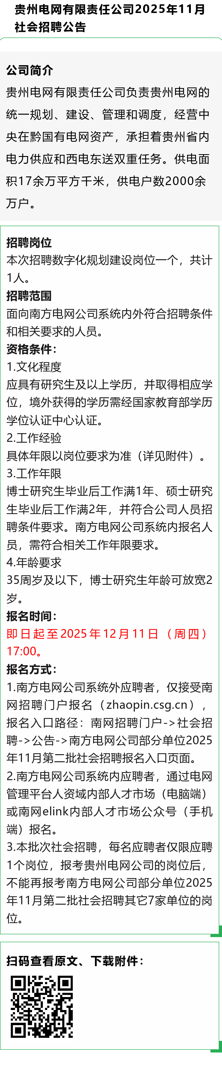 贵州电网有限责任公司招聘!报名截止时间:2025年12月11日!