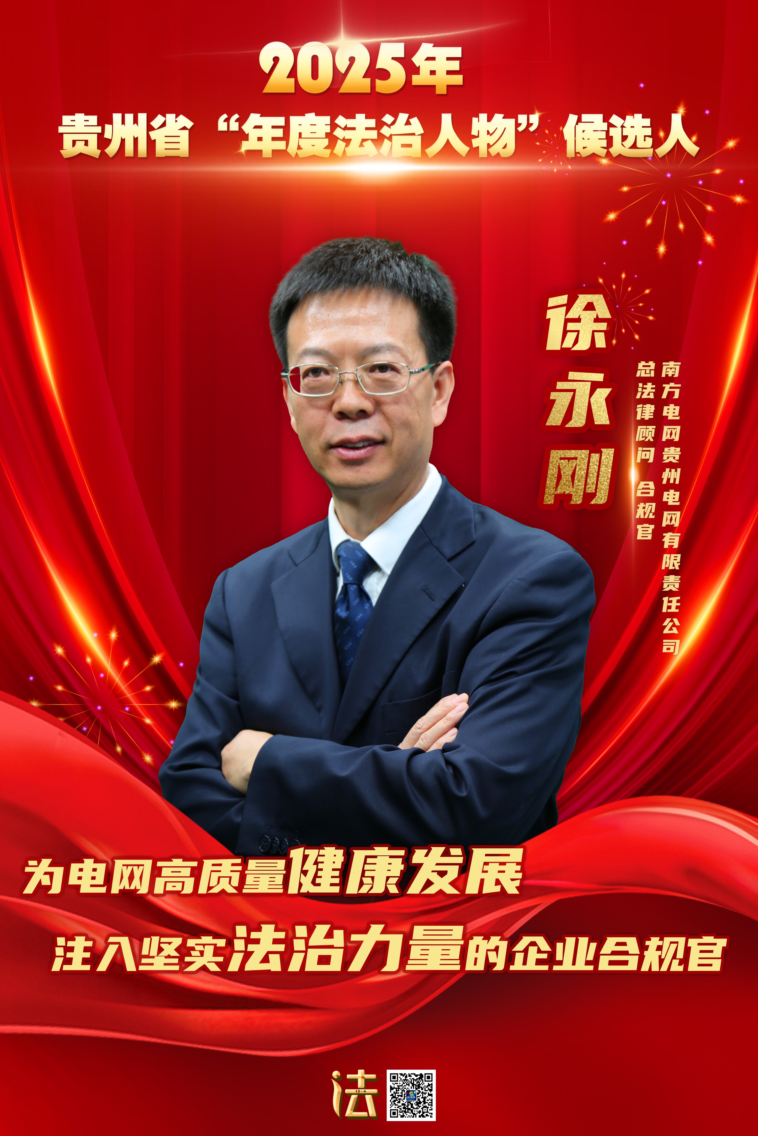 徐永刚,现任南方电网贵州电网有限责任公司总法律顾问、合规官。作为国务院国资委“世界一流法治企业”建设试点单位的领军人,他以专业的法律素养、创新的治理理念和深厚的为民情怀,将法治精神深植于企业肌理,打造出备受瞩目的法治央企“贵州样板”。他带领团队荣获贵州省“八五”普法中期表扬单位、南方电网公司法治先进单位等多项荣誉,以法治实践书写了新时代央企治理能力现代化的生动篇章。