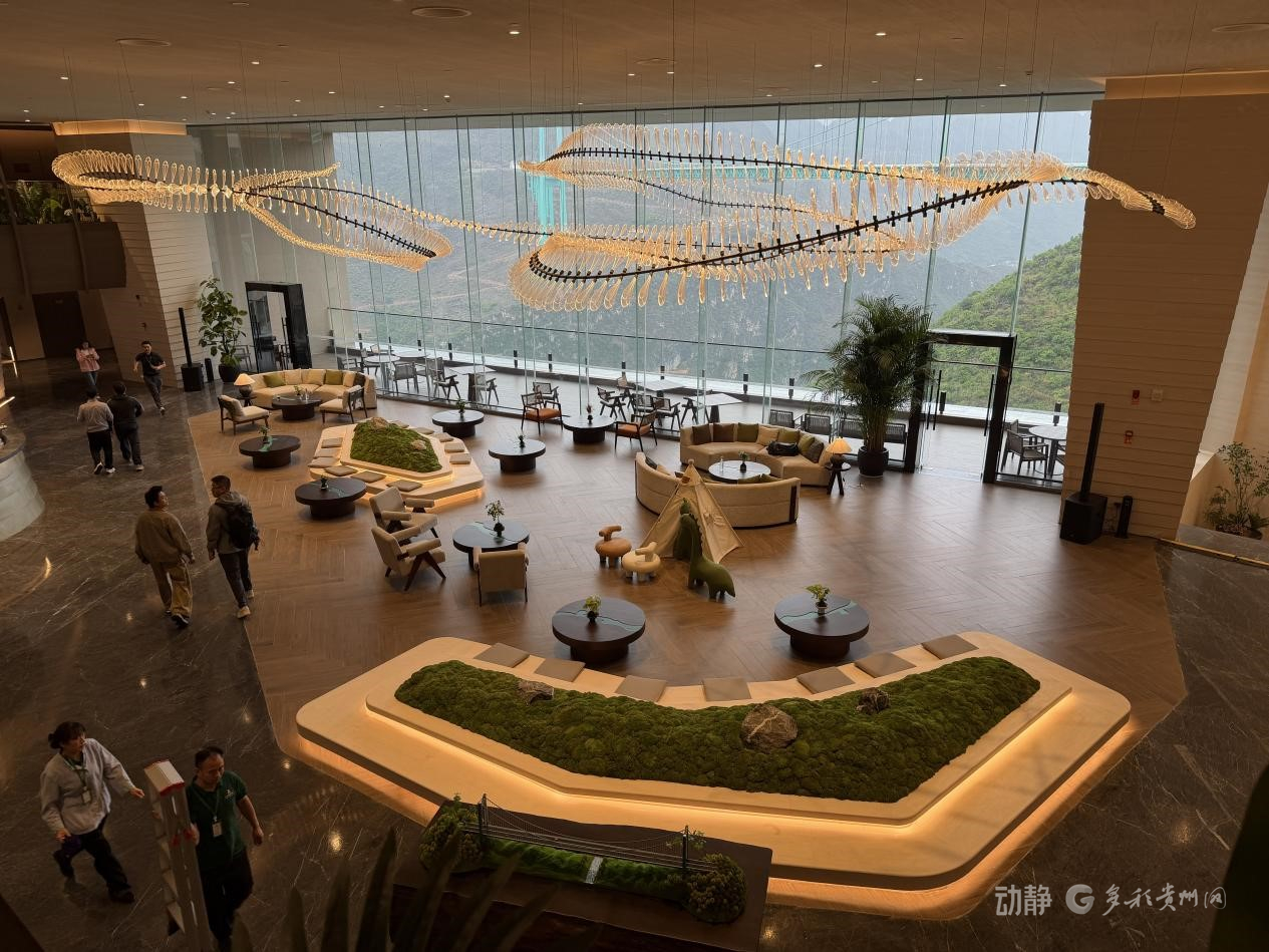 记者在现场看到,酒店设计细节处处体现本地文化与桥梁地标的融合。大堂区域的灯具融入了“关岭贵州龙”的造型,盘旋于半空,成为视觉焦点;客房内的部分挂画也融入桥元素,使室内空间与外部景观形成巧妙呼应。