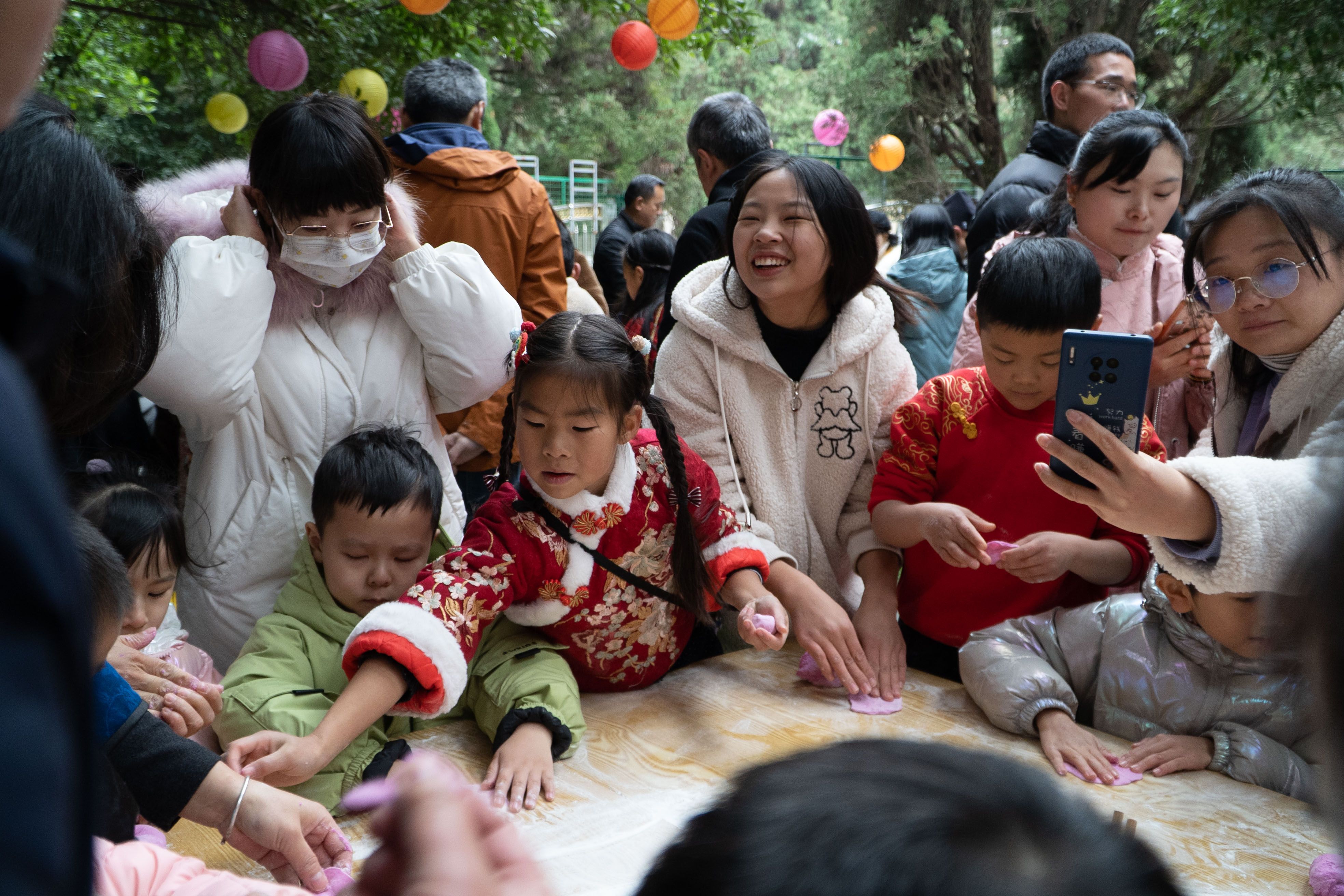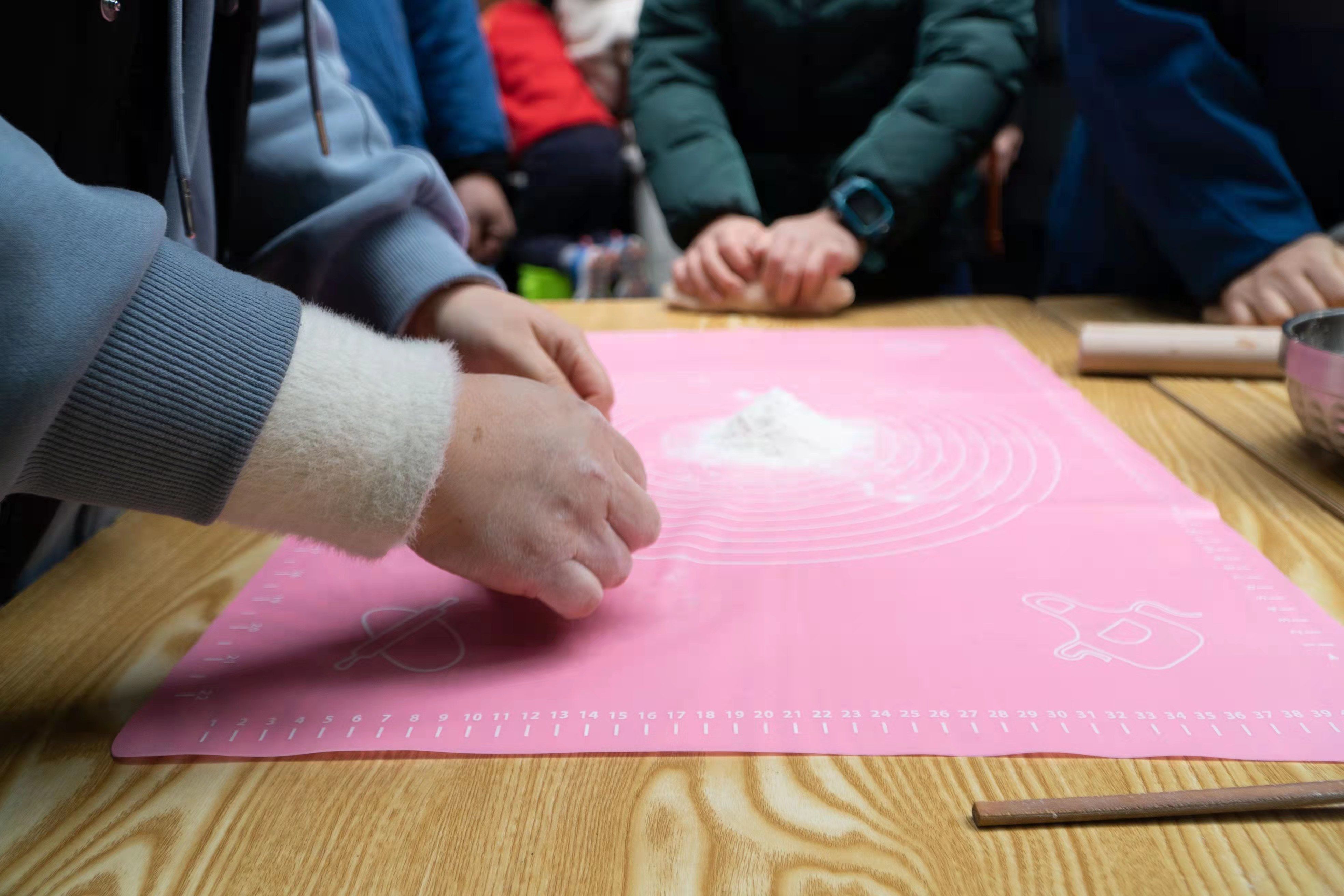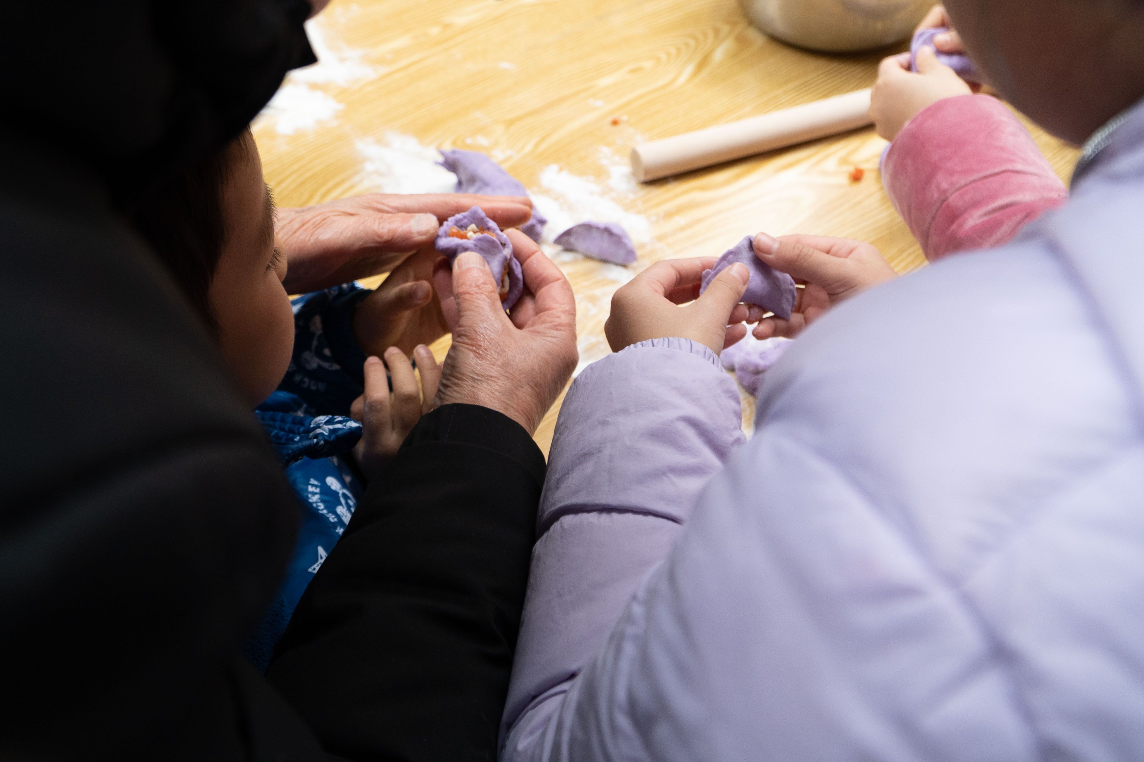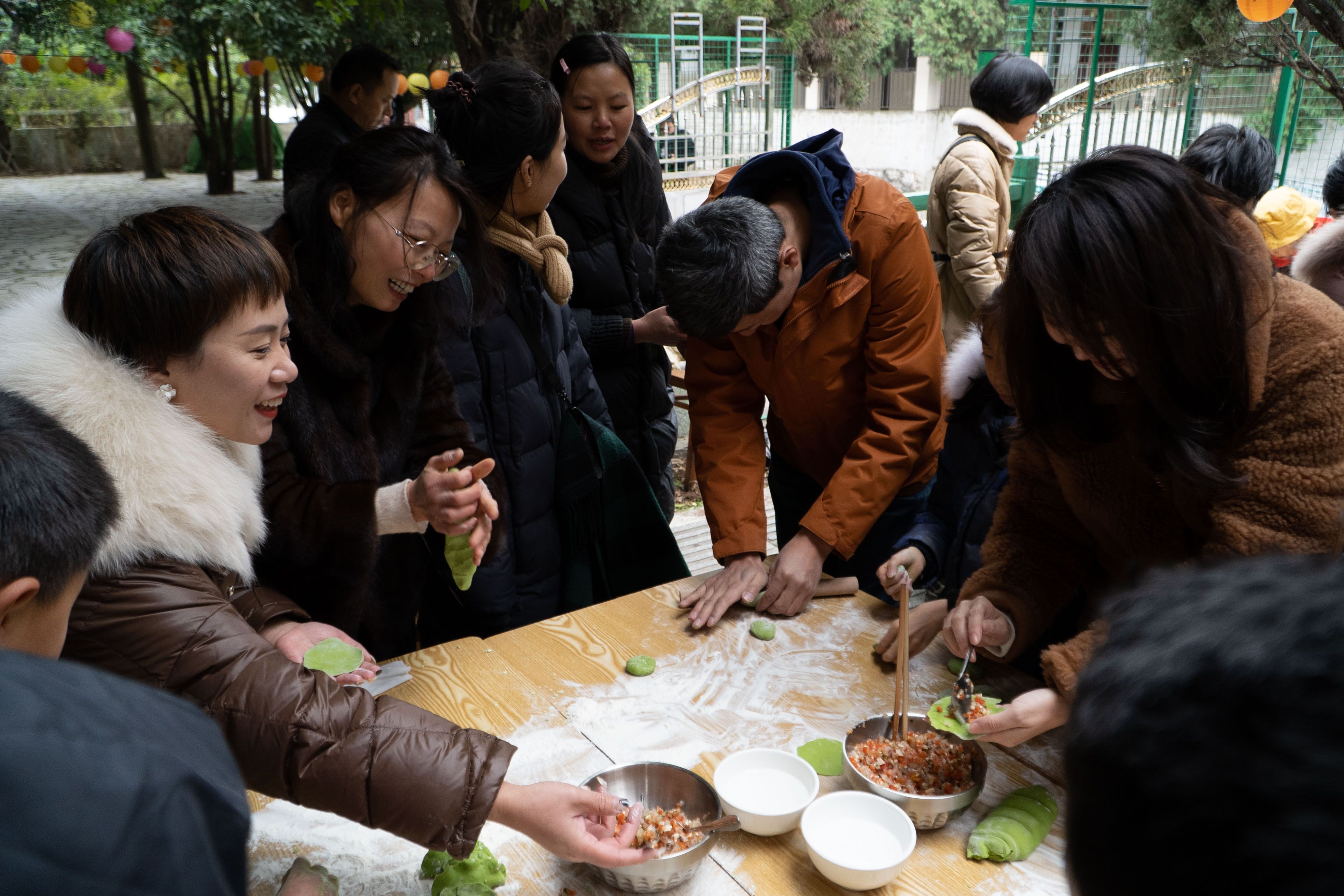 看完绘本剧,孩子、家长和老师们纷纷动手,和面、压皮、做陷,包除了各种颜色的五彩饺子,很快大家就将饺子下进老师事先准备的大锅里,像绘本剧“石头汤”里一样,大家还加入了各种美味的食材,饺子一熟,大家便一起分享了这美美的一餐。