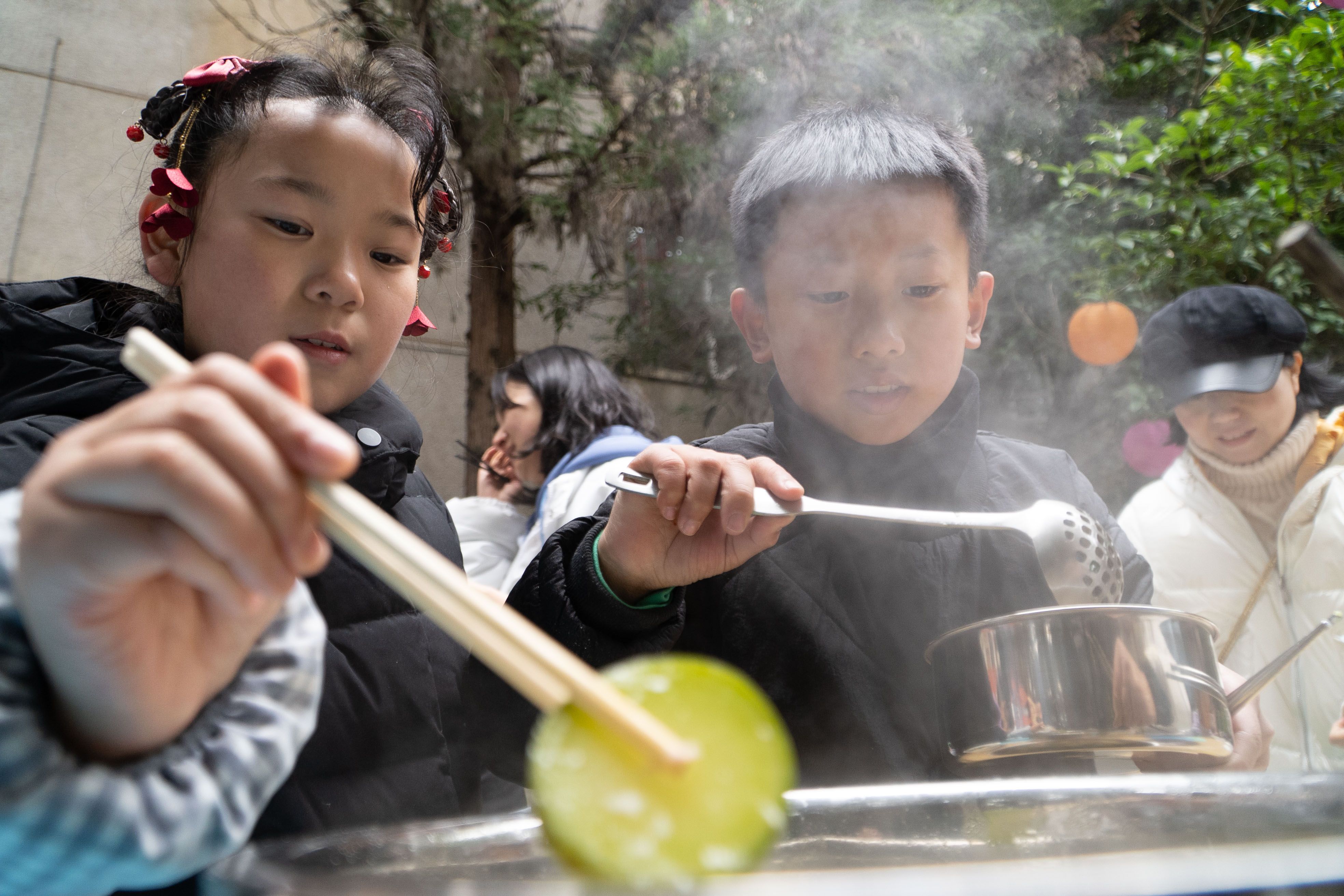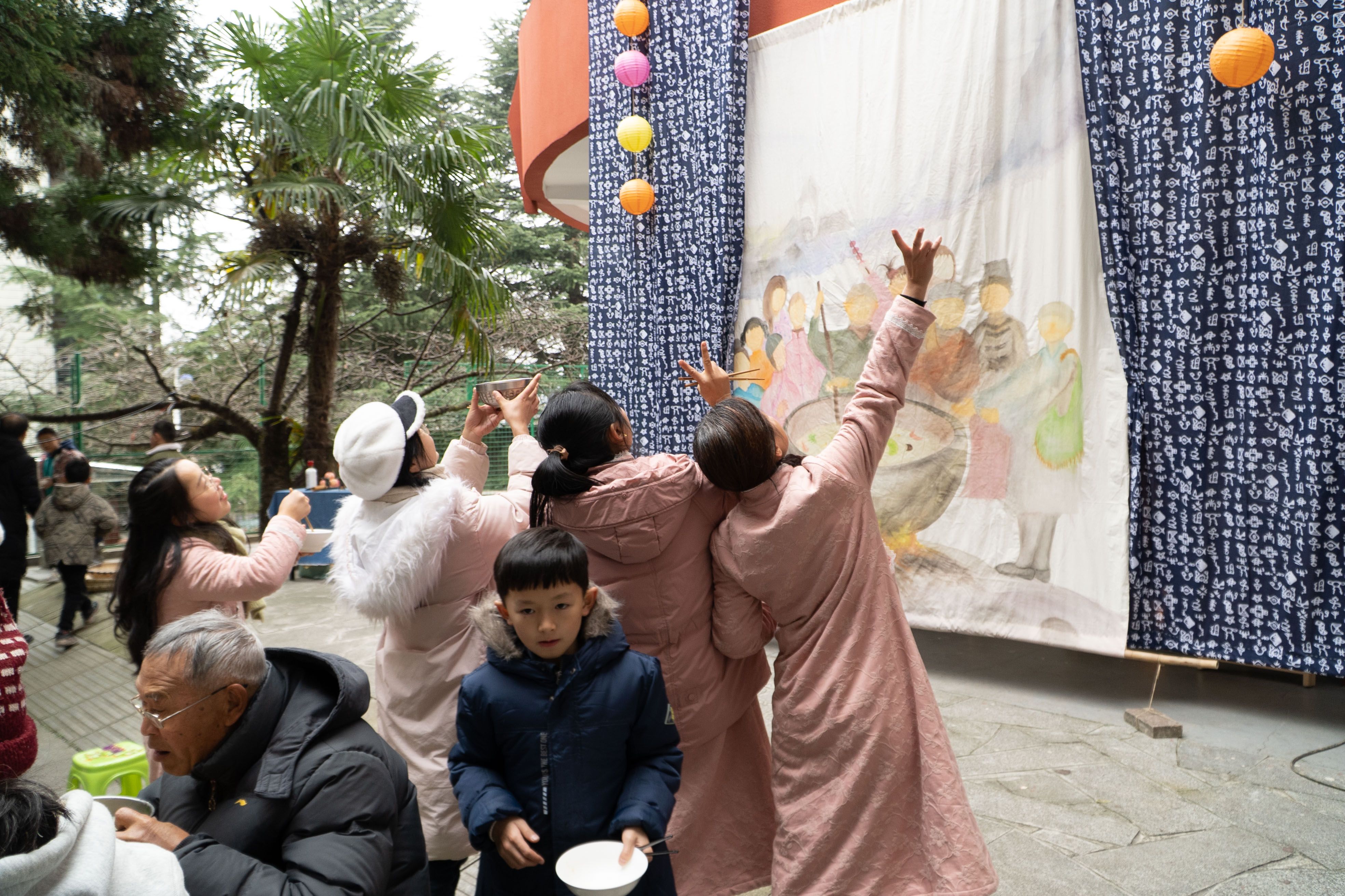 在学校,孩子们观看了由老师表演的冬至绘本剧《石头汤》,戏剧通过三个和尚用智慧聚集食材、一起分享的故事,告诉孩子们,幸福便是合家欢乐与家人相处的日子。