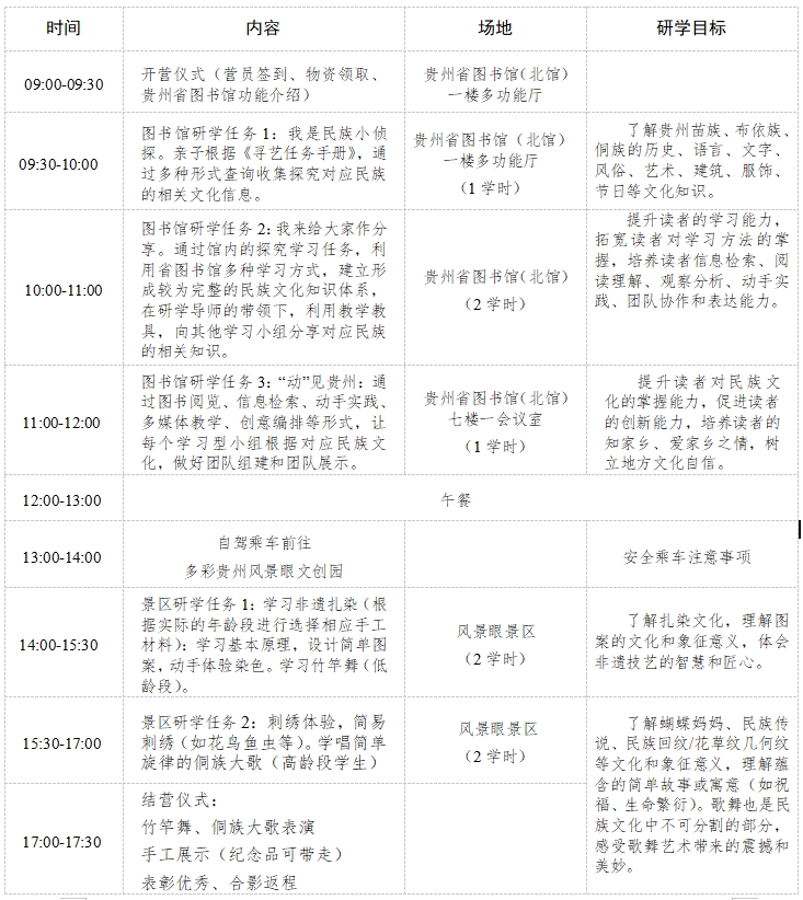 出行方式。本次活动全程需参加人员自驾出行。上午在贵州省图书馆集合签到,下午活动结束后从多彩贵州风景眼文创园自驾返程。请家长提前规划好行车路线及停车事宜。