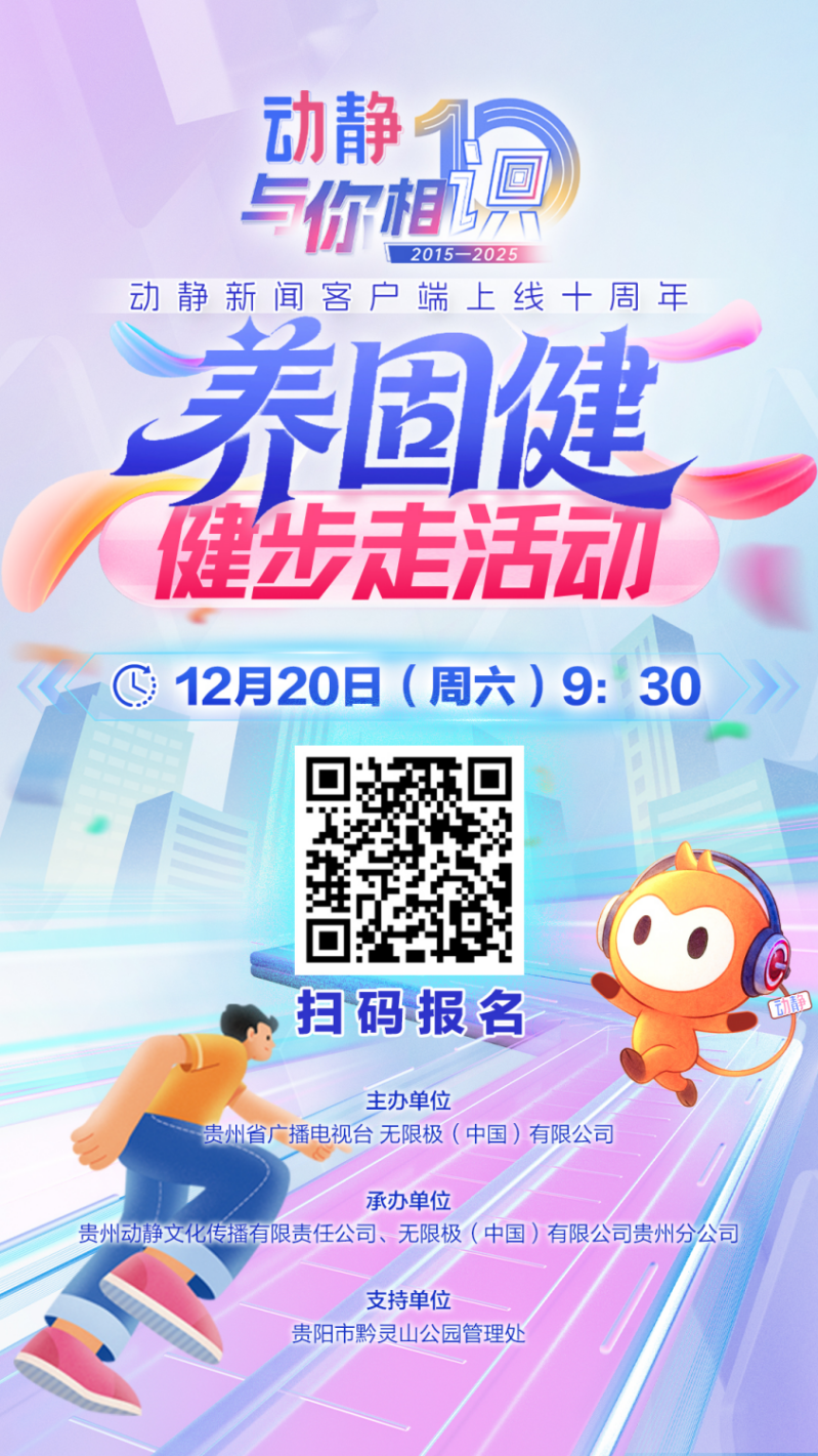 “动静与你相识”动静新闻客户端上线十周年——“养固健”健步走活动即将于12月20日在贵阳市黔灵山公园东大门(樱花巷位置)暖心开启,除了现场丰富的互动体验与丰厚奖品,专属打卡福利已就位,轻松参与即可锁定精美礼品!