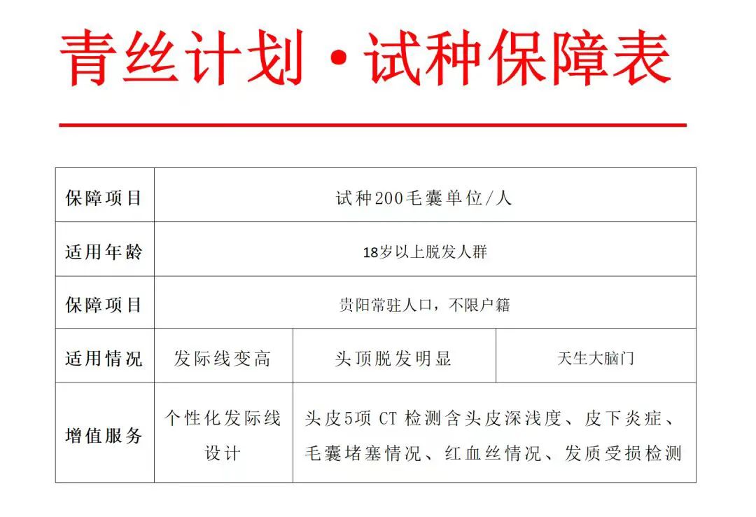 本次活动指导单位负责人表示,为切实降低脱发对形象的影响,鼓励及时解决脱发、掉发、发际线高、脑门大、头油多等毛发困扰,对贵阳18岁以上脱发群体推出“植发试种”,且不限年龄、不限户籍、不限性别,尽量惠及更多街坊,每人可以试种200个毛囊单位。