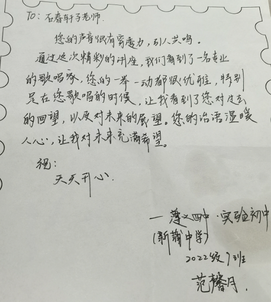 本次讲座覆盖面广,不仅走进高等院校音乐学院,还将专业的音乐知识打包带进基层中小学及山区幼儿园,是对大中小学一体化音乐教育的全新尝试。讲座内容也十分丰富,既包括民族声乐领域的专业介绍,又结合团队暑期在黔调研成果,融入贵州红色歌谣文化,是艺术教育的本土化、本地化的全新探索。同时,本次讲座还是充分用好上海地区优质教育资源,深入挖掘贵州红色文化资源,促进沪黔教育资源交流,共同推动美育教育高质量发展的全新途径。