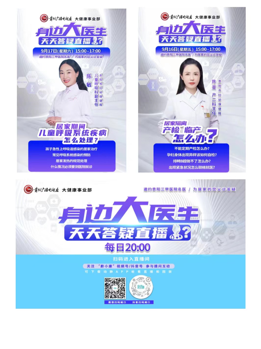 从9月16号开始,《身边大医生》通过动静APP和黔小康的官方视频号进行同步直播,邀请贵阳市多家三甲医院的大医生来到直播间,为大家在线答疑,让大家足不出户也能获得省内大医生问诊看病……