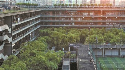 位于成都市青羊区的西村大院最符合这段表述。这是一个覆盖了整个街区的五层建筑,刘家琨为西村设计了一个最大化的内部绿地空间,将建筑绕着最外边做了一个总长1.5公里的大围合,并为骑行者和行人设计了既开放又围合的连续运动路径。人们沿着有坡度的小径向上,景物在不停变换。