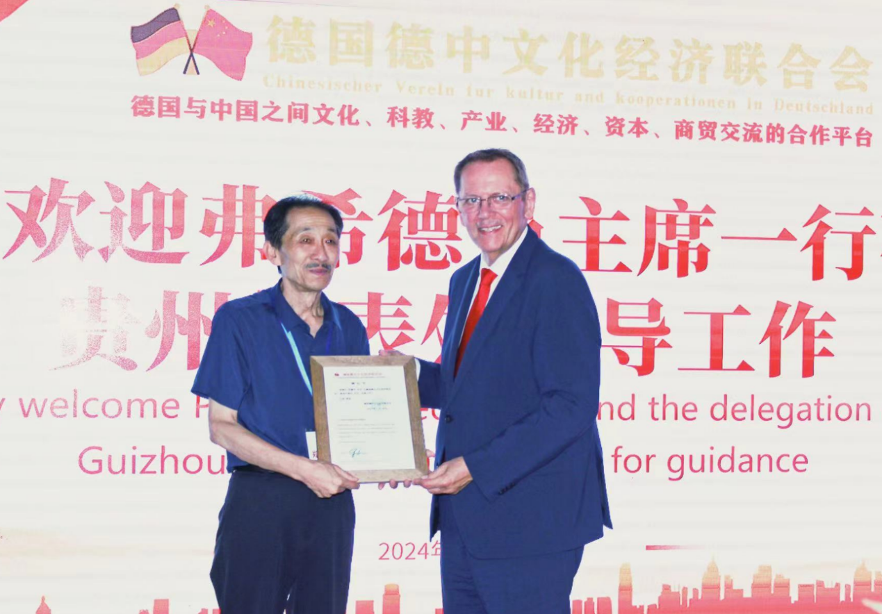 德中联合会弗希德曼主席为贵州代表处颁发聘任书,郑鲁平先生担任德国德中文化经济联合会贵州代表处主任,祁登强先生担任贵州代表处秘书长。