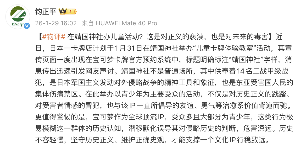 更值得警惕的是,宝可梦作为全球顶流IP,受众多且大部分为青少年,这类行为极易模糊这一群体的历史认知,潜移默化误导其对侵略历史的判断,危害深远。历史不容轻慢,坚守历史正义、维护正确史观,才能支撑一个文化IP行稳致远。