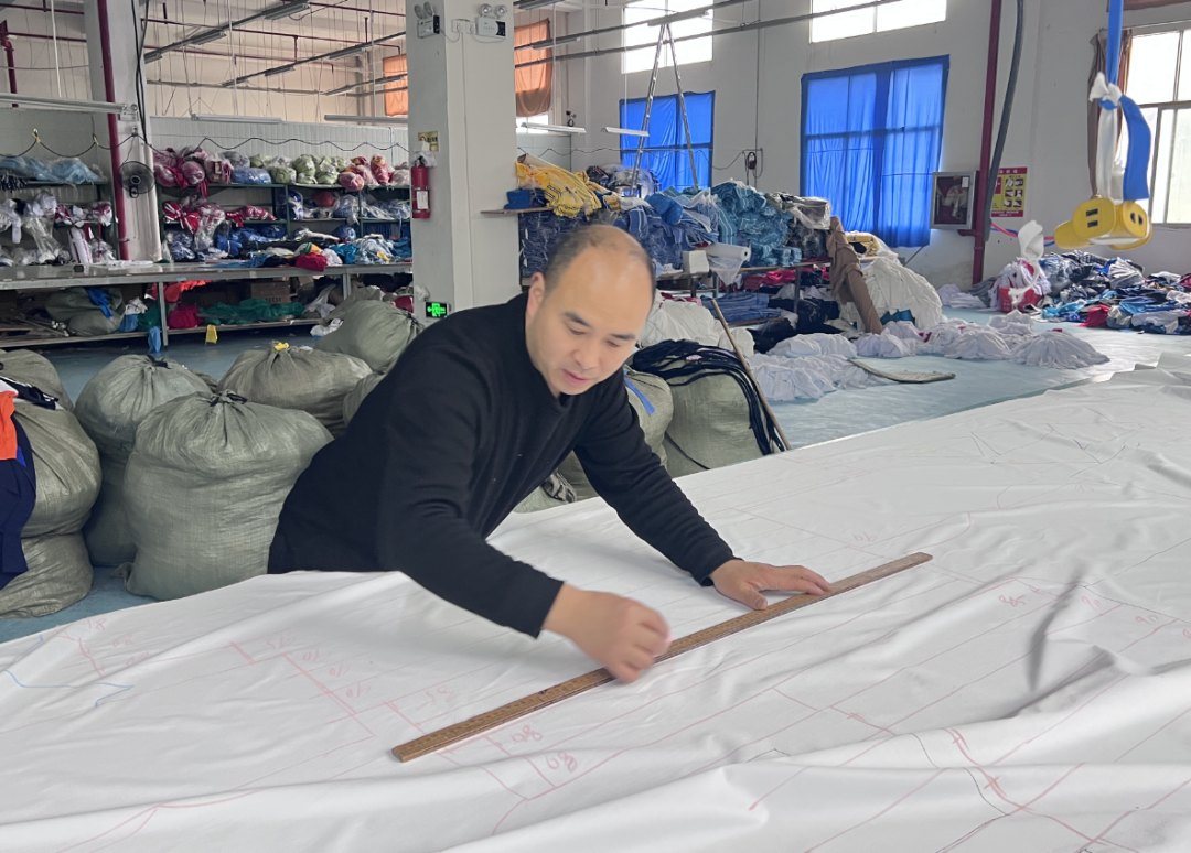一旁的设计师傅正全神贯注地用量尺、皂片在布料上画图,精心设计款式,确保衣服符合客户需求。公司负责人蔡志溪在车间到处查看,随时解决员工需求。
