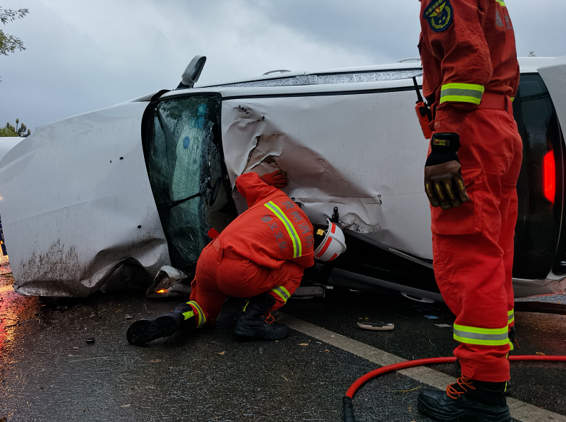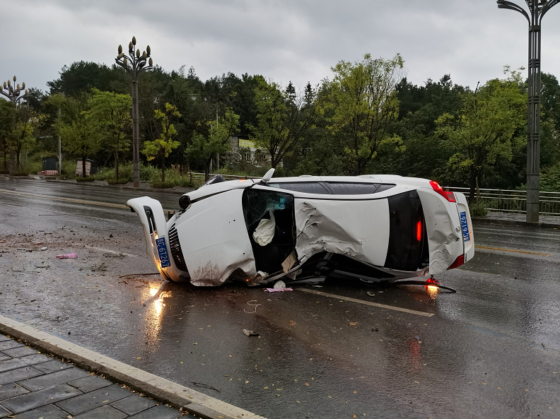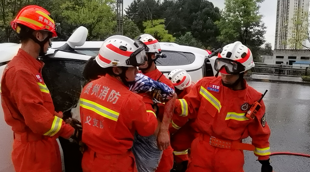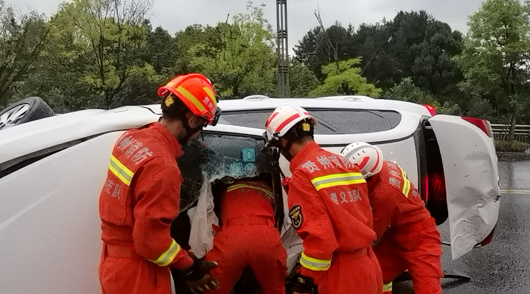 9月12日上午,遵义市汇川区汇川大道往绥阳方向老路有一车辆侧翻,车内有一名被困人员,需消防人员帮助。