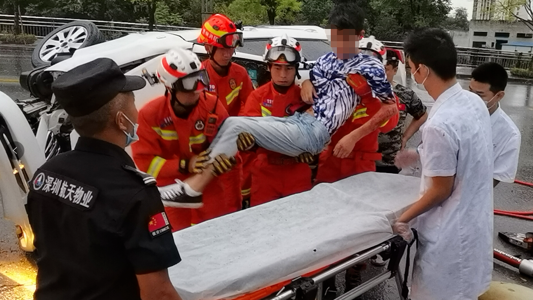 经过8分钟左右的紧张营救,三名指战员成功将被困人员救出,抬上救护车,紧急送往医院救治。