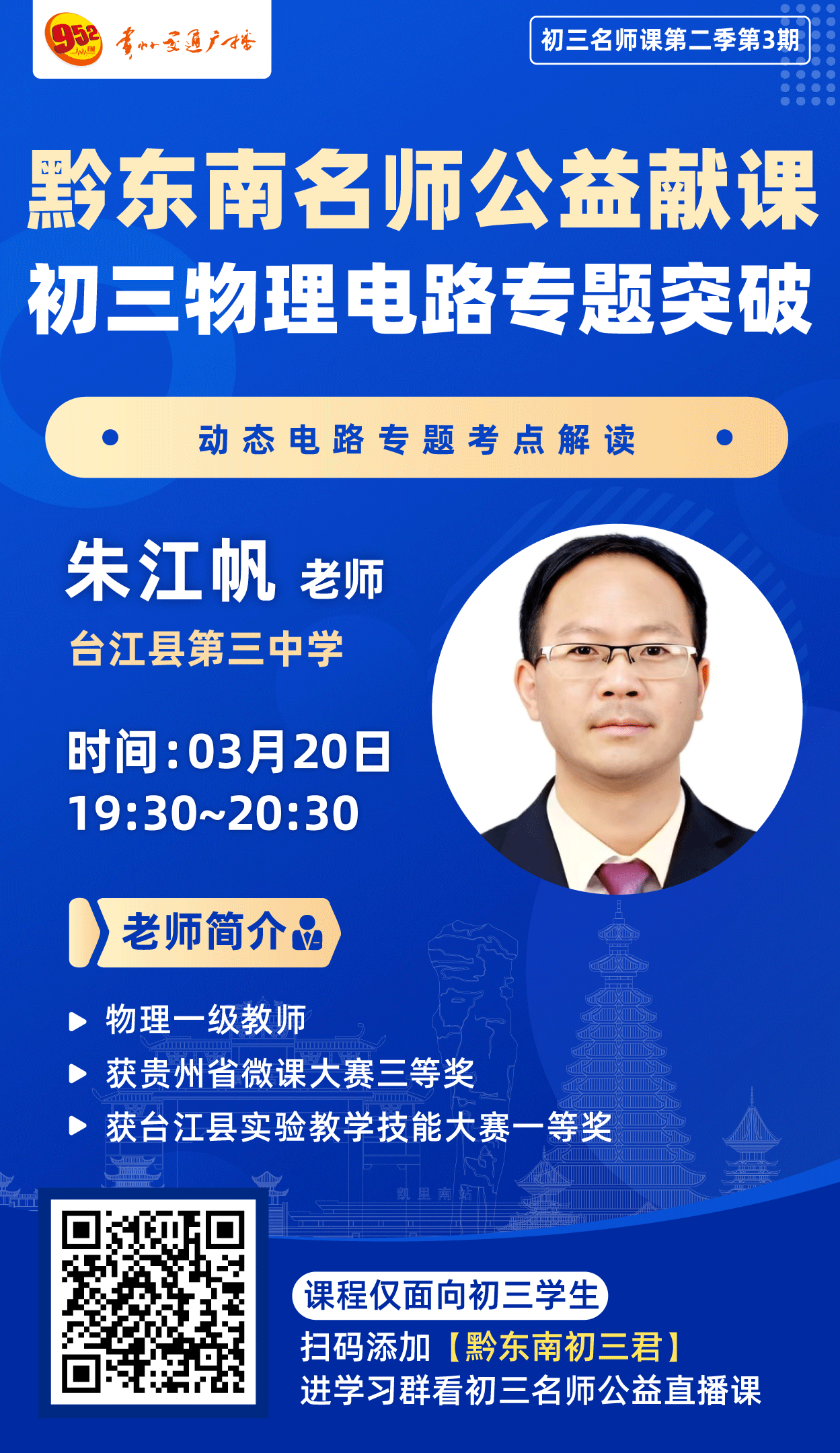 3月20日19:30-20:30,物理一级教师朱江帆老师将开展“动态电路专题考点解读”课程,朱老师曾获贵州省微课大赛三等奖、台江县实验教学技能大赛一等奖,凭借扎实的专业功底和丰富的教学经验,精准剖析动态电路核心考点与解题思路。