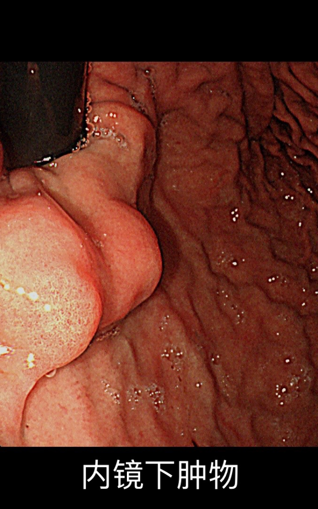 55岁男性患者莫某,因在黔南州人民医院消化内镜中心门诊行无痛胃镜检查时,发现胃底穹窿部可见一大小约3.3.cmx1.5cm的黏膜下隆后住院治疗,经超声胃镜检查提示隆起来源于固有肌层。