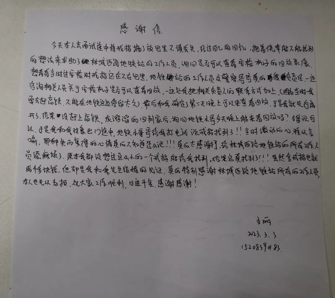 当日21时许,王女士到达林城西路站警务室,特意为警务人员购买了点心和饮料,并送上了一封手写感谢信,再三对民警、辅警认真责任工作态度给予高度称赞和好评。