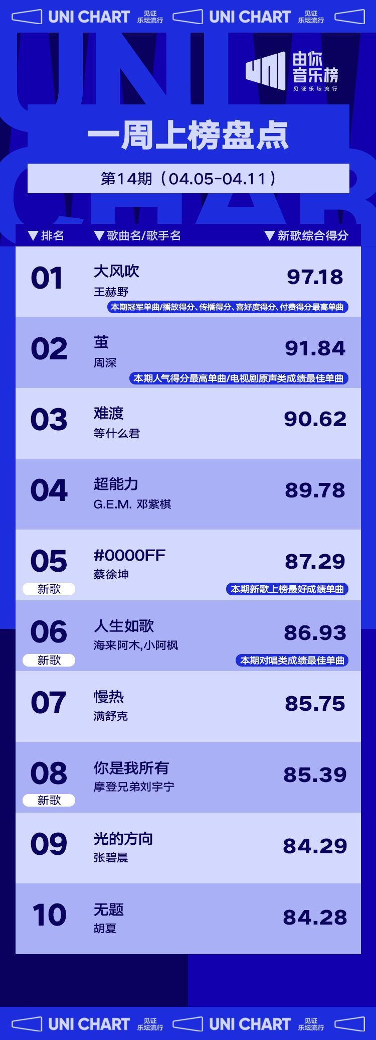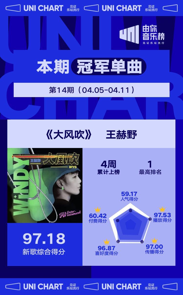 本期冠军单曲来自王赫野演唱的《大风吹》,与此同时,该曲凭借超高的短视频传播效应,一举拿下了本期播放得分、传播得分、喜好度得分、付费得分最高单曲的好成绩。