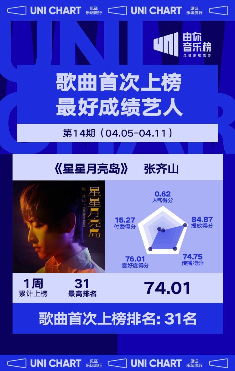 张齐山凭借歌曲《星星月亮岛》首次上榜,使得张齐山成为本期歌曲首次上榜最好成绩艺人。