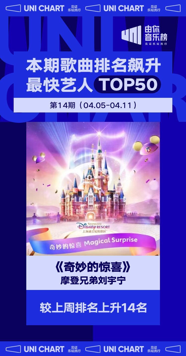 摩登兄弟刘宇宁演唱的《奇妙的惊喜》较上周排名上升14名,使得摩登兄弟刘宇宁成为本期歌曲排名飙升最快艺人。