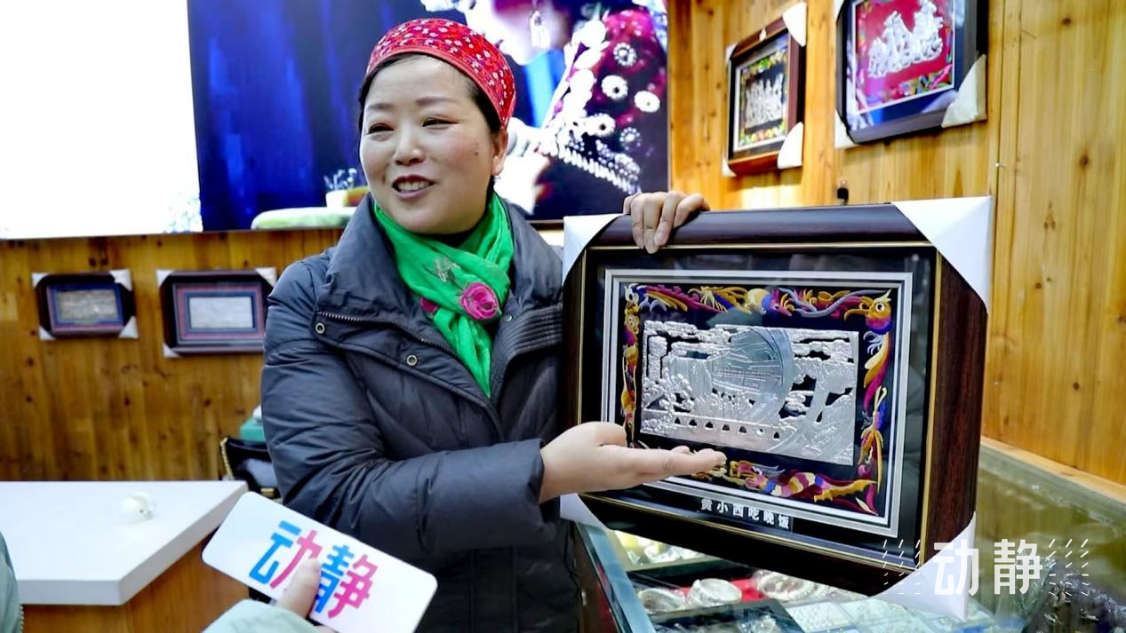 苗绣、银饰等具有贵州文化特色的纪念品深受欢迎,在这家原创银饰店,新推出的“黄小西吃晚饭”民族银绣画框最为畅销,据说上市以来已经卖出1000多幅。