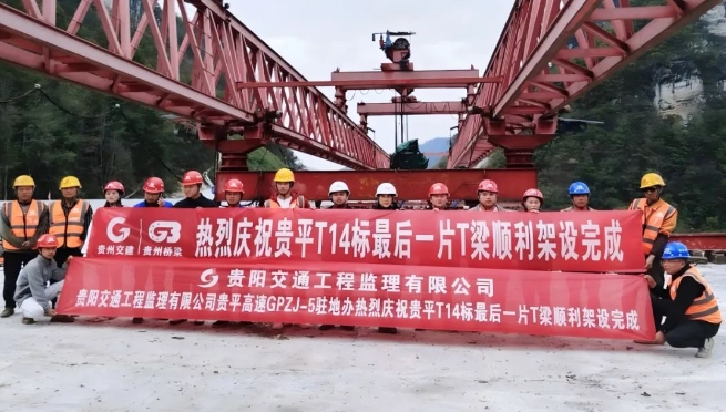 近日,贵州高速集团所属黔通安达公司下属交通监理公司贵平GPZJ5驻地办承监的贵阳至北海高速公路贵阳至平塘(黔桂界)段项目T14标小广田坝二号桥T梁全部架设完成。