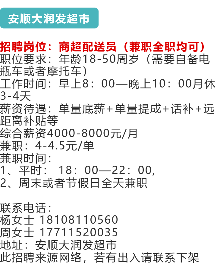 大润发超市招聘商超配送员!月薪可达8000元!兼职全职均可!