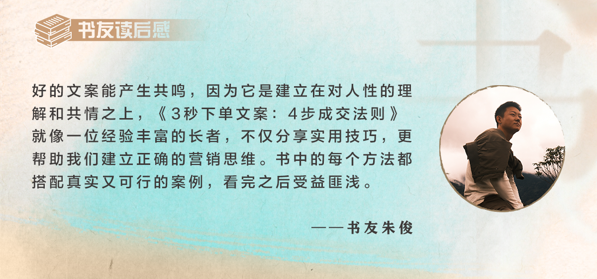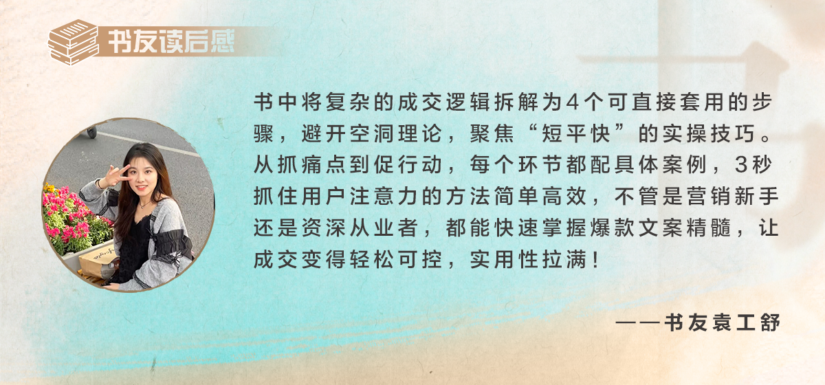 在流量成本日益高涨的今天,优秀的文案已成为企业的核心竞争力。涂一方的《3秒下单文案:4步成交法则》以其系统化的方法论、丰富的实战案例、前瞻性的行业洞察,为渴望通过文字实现商业转化的从业者提供了宝贵的实战指南。无论是营销新手还是行业老兵,都可以从书中获得可落实的技巧与思维启发,在文案创作的道路上少走弯路,实现从“文字表达”到“商业变现”的阶梯跨越。