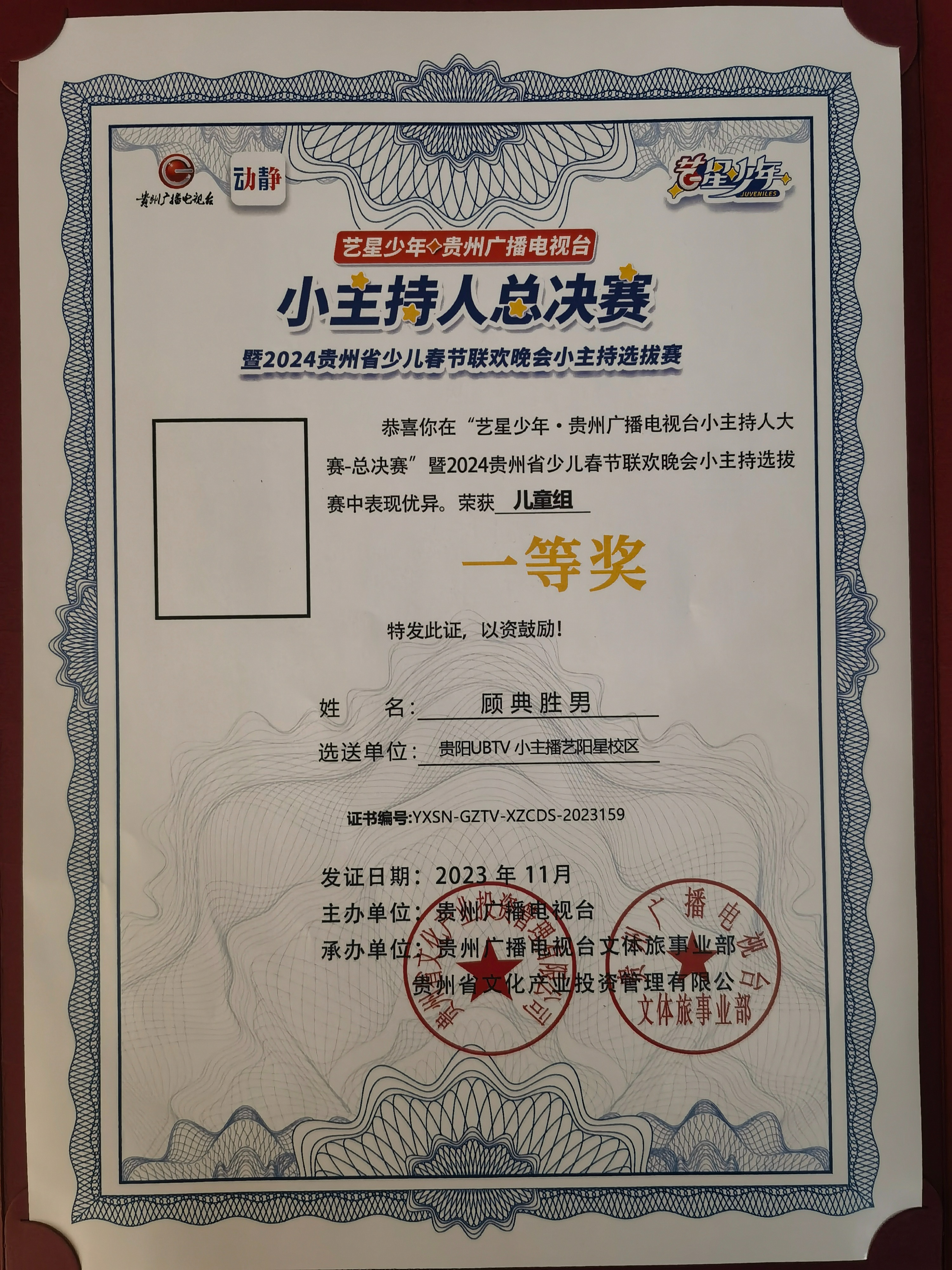 2023年贵州广播电视台小主持人总决赛一等奖;
