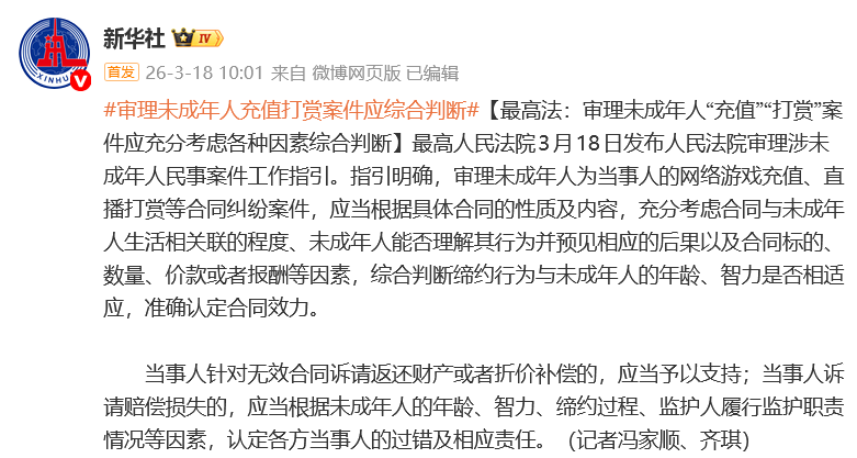 最高法:审理未成年人网络游戏充值、直播打赏等合同纠纷案件,应综合判断缔约行为与未成年人的年龄、智力是否相适应