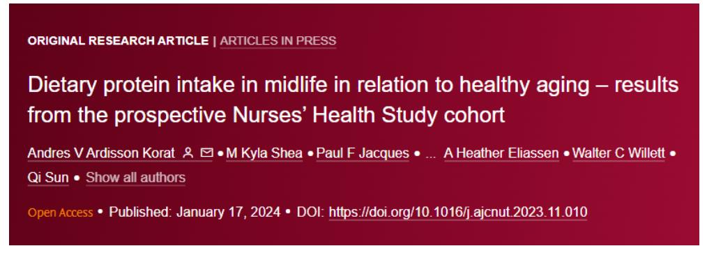 2024年1月,哈佛大学孙祺教授团队在《美国临床营养学杂志》期刊发表了一项研究显示:植物性蛋白质的摄入量与延长健康寿命相关。