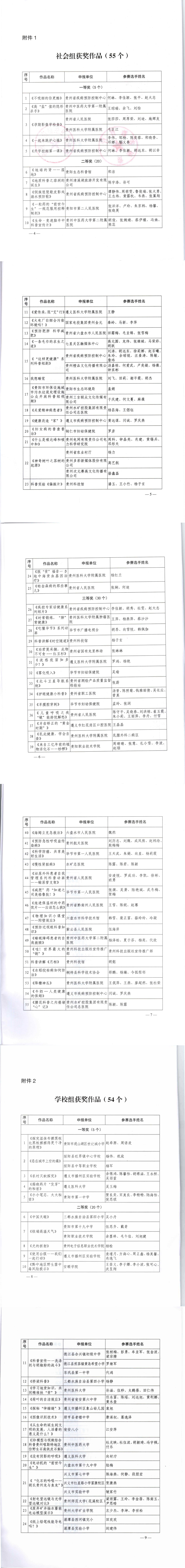 获奖作品中,社会组获奖作品55个(一等奖5个、二等奖20个、三等奖30个),学校组获奖作品54个(一等奖5个、二等奖20个、三等奖29个)。