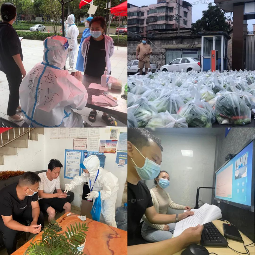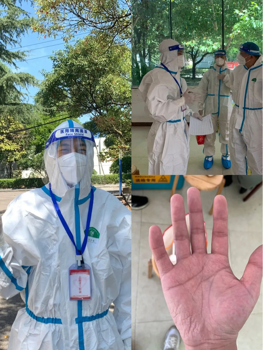 在社区的防疫工作中,第四检察部干警代晨负责小区群众的抗原检测工作,30多度的气温里穿着密封的防护服不断爬楼扫楼,他很快就大汗淋漓,手在乳胶手套里被汗水泡得发白,浸得皱皱巴巴,但并不妨碍他继续投入战斗。