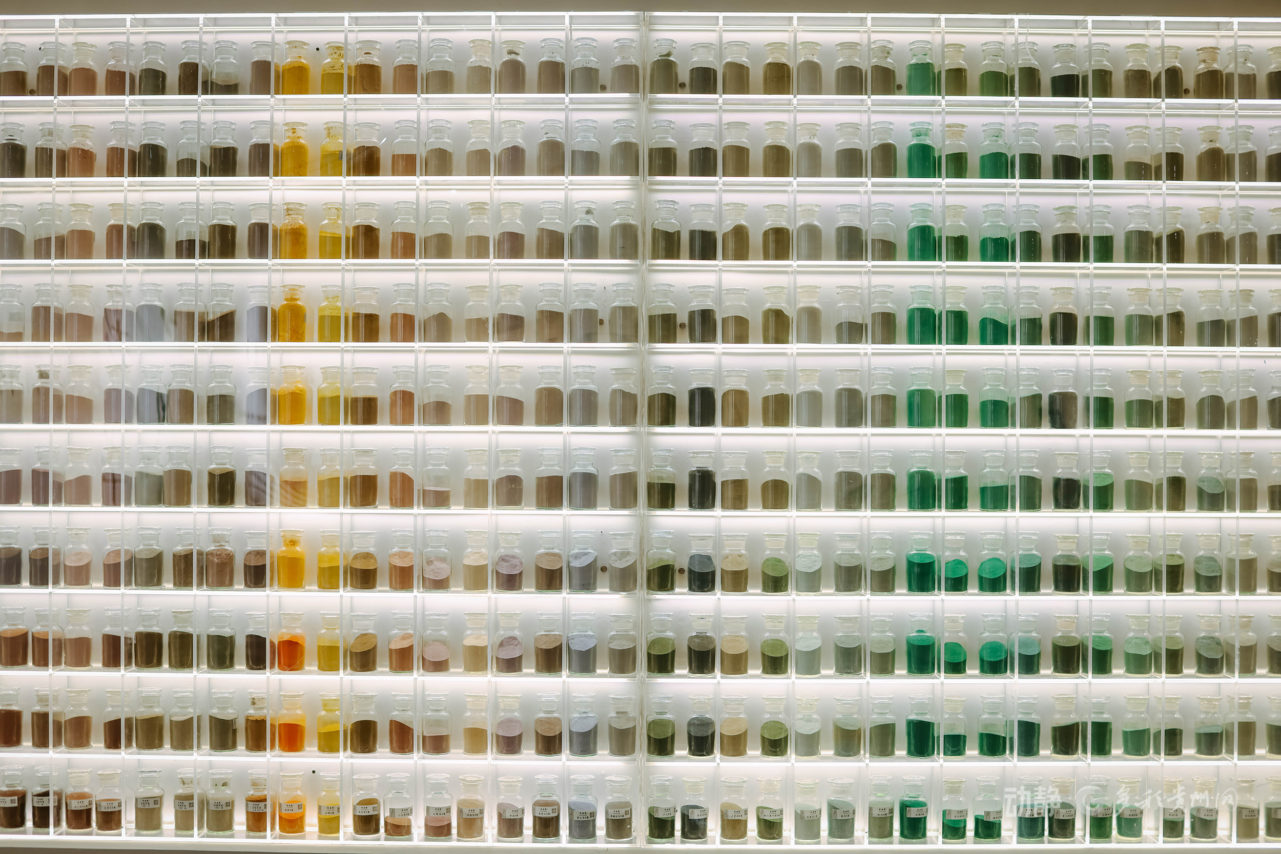 展览共呈现30组馆藏矿物标本、600余瓶矿物颜料,以及50位艺术家的77件/组岩彩作品,完整勾勒出从自然矿物到艺术创作的生动脉络。它让我们看见最美的色彩无需化学合成,大地本身就有最丰富的色谱;最恒久的艺术离不开时间的沉淀,如同这些矿物穿越亿万年光阴来到我们面前。