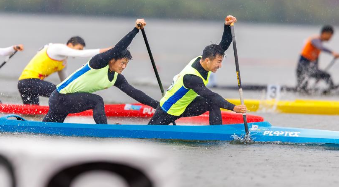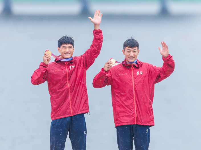 随后,男子双人划艇500米决赛展开角逐,遵义运动员雷宇航、陈兵同样发挥出色,虽然起步稍慢,但两人配合默契,在100米后便一直领先对手,以1分44秒151的成绩获得金牌。