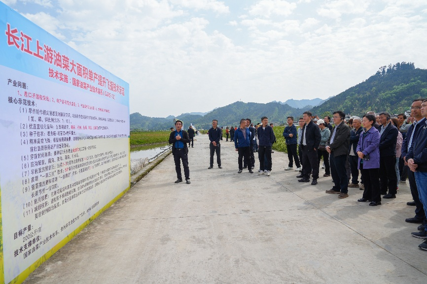 本次活动核心观摩点——瓦屋大坝3000余亩科技支撑油菜大面积单产提升示范基地,采用稻油轮作、育苗移栽、浅旋耕飞播模式,主推油研BD28、油研211等高产优质品种,集成油菜“一增二优三减”高效栽培、轻简化直播等关键技术,实现适时早播早栽、增密度、种子包衣、一播保全苗、水肥耦合、病虫草害统防统治、花期“一促四防”、机收减损全链条提质,推动“四良”深度融合,示范带动当地油菜大面积单产稳步提升,亩均单产较前三年平均提高10至15公斤,既筑牢粮食安全根基,又持续拓宽群众增收渠道。