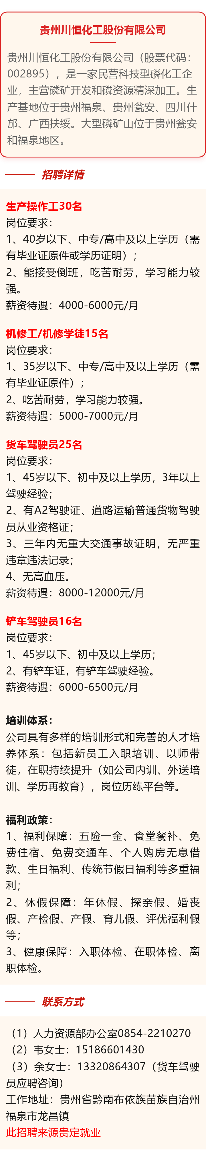 贵州招聘生产操作工、货车驾驶员、铲车驾驶员等岗位86人!月薪4000~12000元!五险一金!免费住宿!