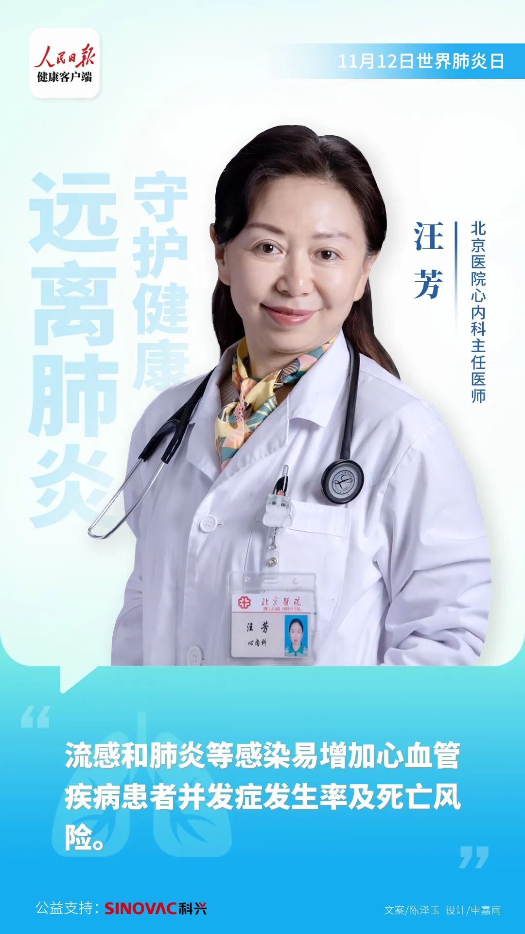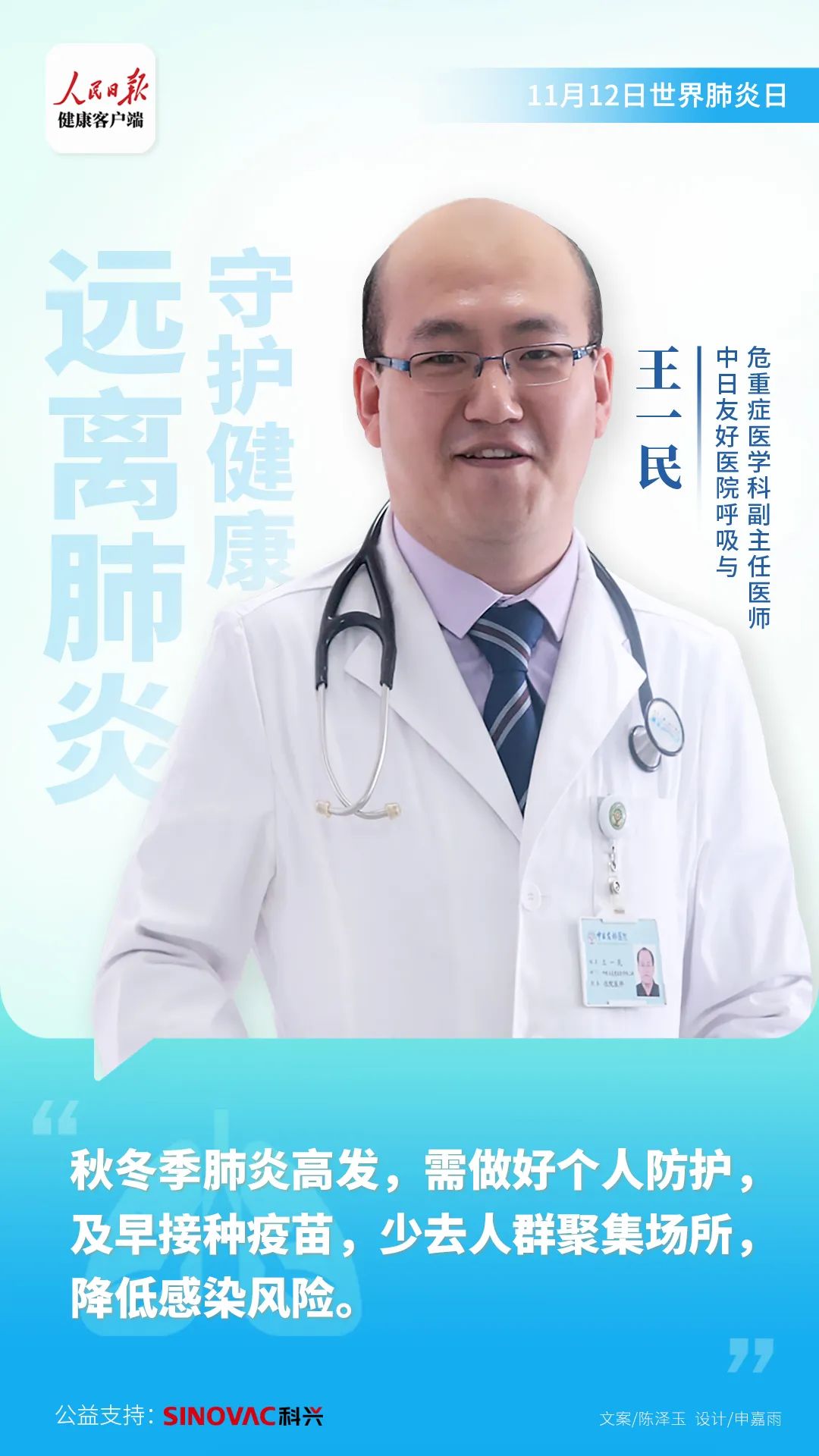 作为心血管大夫,我们也特别关注孩子和老年人等抵抗力低弱的人群,特别建议在季节更替时节,要及时接种疫苗。如果肺部出现不适症状,要积极来医院治疗,避免病情加重。