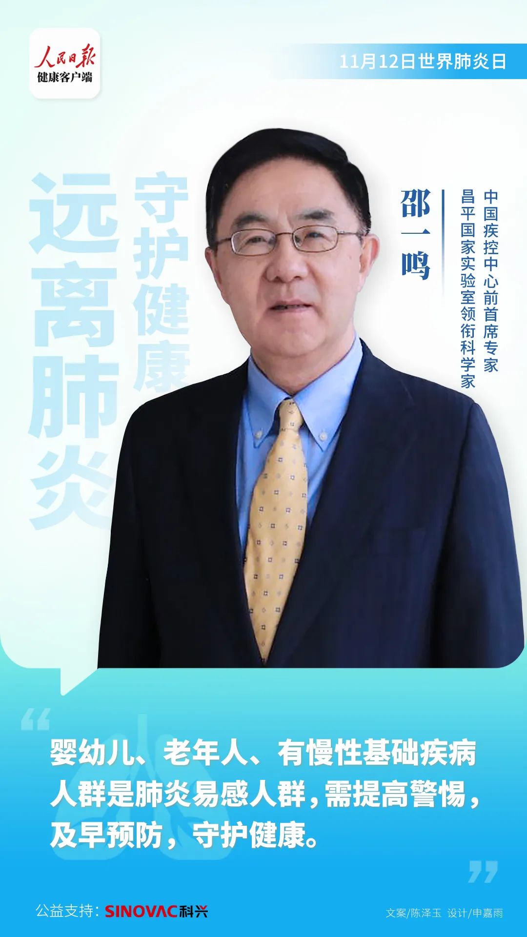 面对这些问题,人民日报健康客户端特别策划、SINOVAC科兴公益支持了“远离肺炎,守护健康”活动,邀请昌平国家实验室领衔科学家、中国疾控中心前首席专家邵一鸣教授,北京医院心内科主任医师汪芳教授,北京医院内分泌科主任潘琦教授,中日友好医院呼吸与危重症医学科副主任医师王一民教授解答关于肺炎的高频问题,一起科学预防肺炎,拥有畅快呼吸。