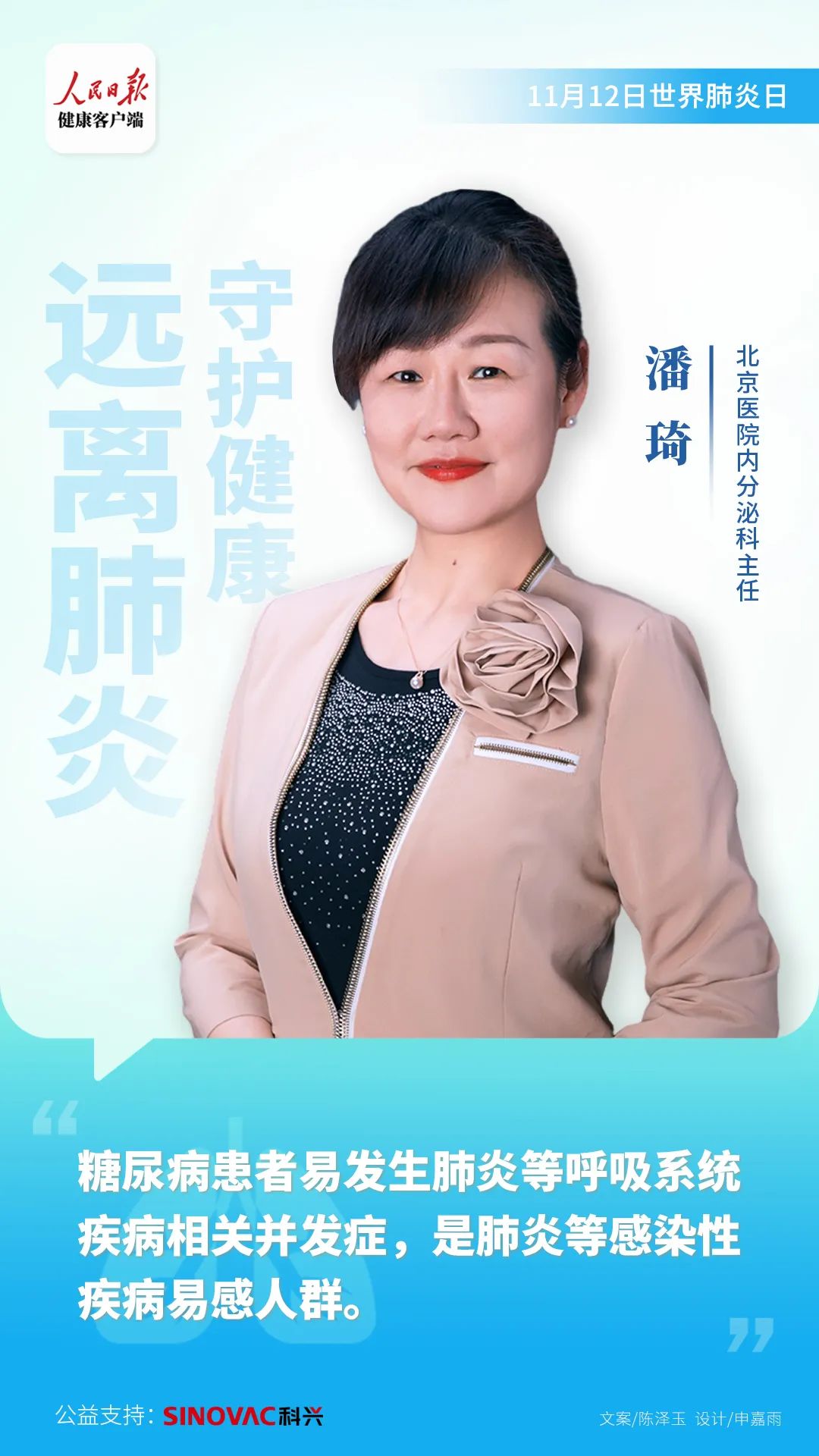 潘琦:糖尿病患者由于免疫受损,容易受到各种感染,肺炎是糖尿病的最常见的并发症之一。