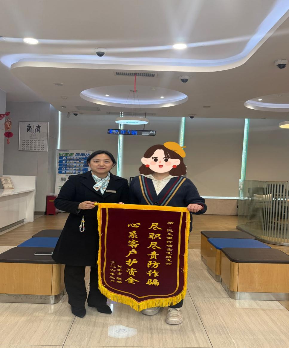 为表达对民生银行贵阳瑞金北路支行工作人员的感激之情,3月26日,黄女士特意将一面印有“尽职尽责防诈骗,心系客户护资金”的锦旗送到支行。她感慨地表示:“如果不是银行工作人员的细心提醒,自己的辛苦钱可能就打水漂了。民生银行真正做到了‘以客户为中心’,用专业和温暖守护了我的资金安全。”