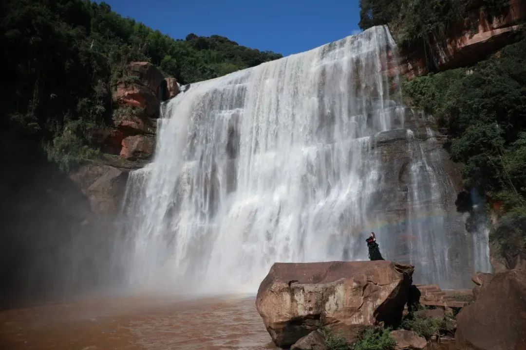 赤水大瀑布高76米,宽80米,是长江流域最大的瀑布、赤水丹霞瀑布群的代表。在茫茫林海中穿行后,便可见河水从丹霞绝壁上一泻而下。碰上日照晴好的日子,便会上演瀑布上彩虹辉映的奇观。巨大的高差让跌落的瀑布升腾起弥漫的水雾,胜过任何降温喷淋装置。