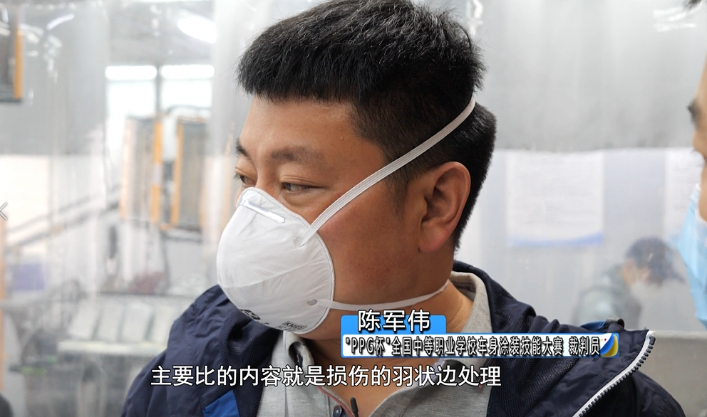 2023年“PPG杯”全国中等职业学校车身涂装技能大赛裁判员 陈军伟:现在比的是损伤区处理,这部分主要比的是损伤的羽状边处理、原子灰和原子灰羽状边处理,这个部分对于选手来说要特别注意羽状边的宽度,还有旧漆清理的干净度等。