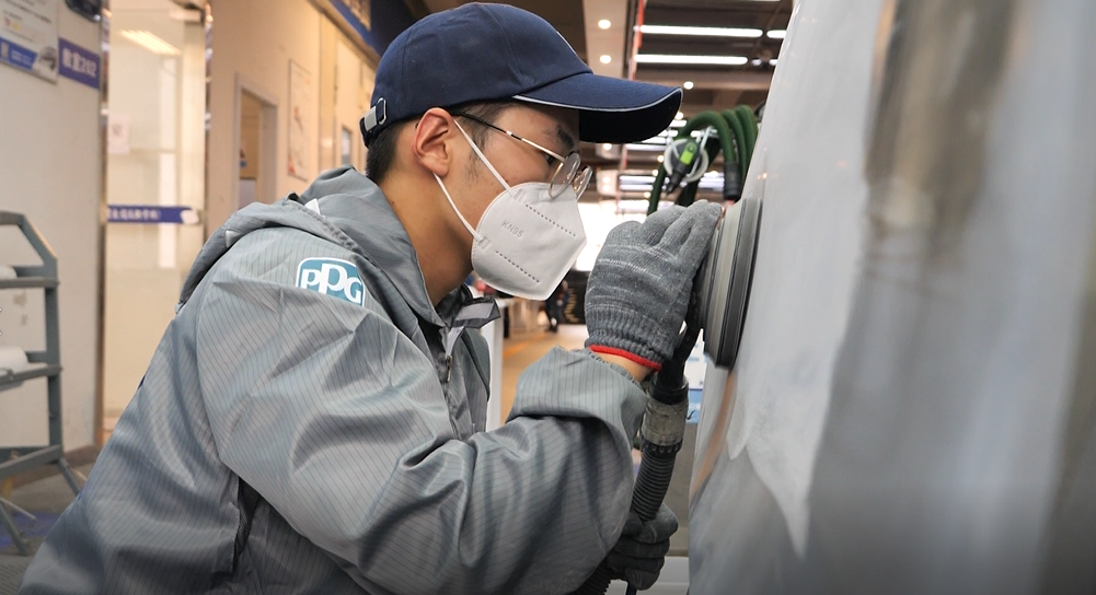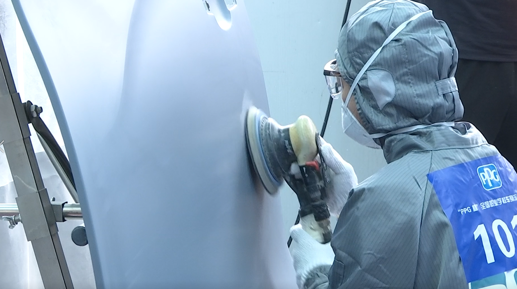 2023年“PPG杯”全国中等职业学校车身涂装技能大赛 裁判长 张小鹏:这个项目还考察从底到面所有的维修技能,比如怎么用原子灰把损伤的部位补平,要确保它能恢复到像没有出过任何事故一样,另外喷漆的颜色也要喷到接近原色。