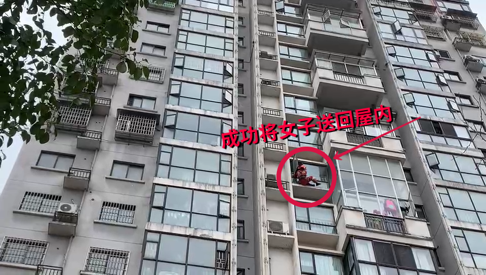 消防救援人员到达现场后,看见居民楼9楼窗台外正站着一名女子,其肢体晃动摇摆、情绪激动暴躁,随时可能跳楼,现场情况十分危急。