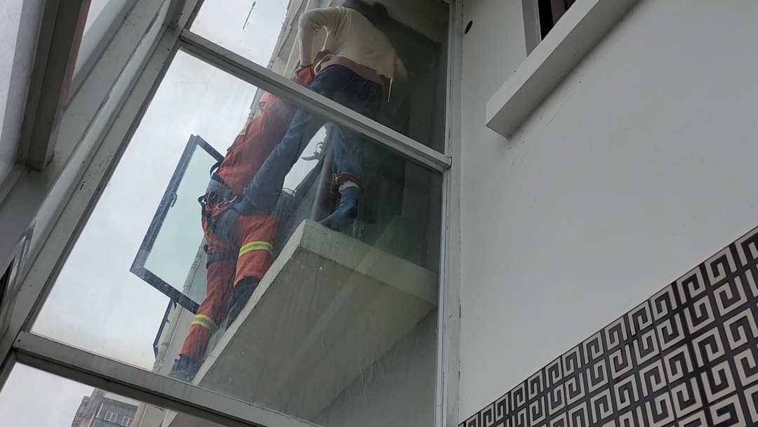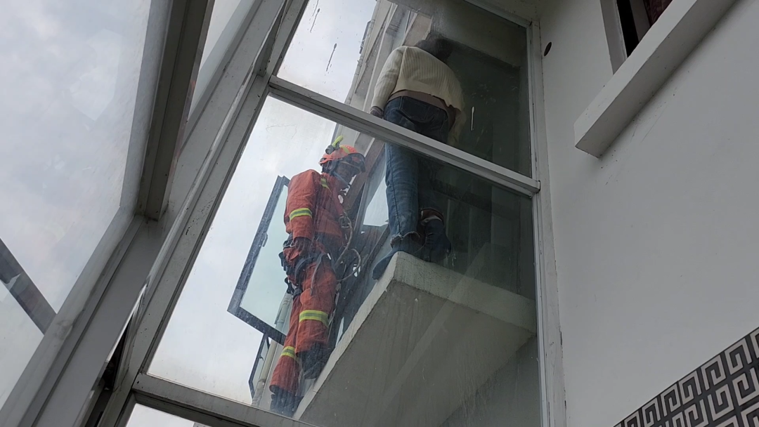 就在救援人员即将把女子救入室内的瞬间,女子不配合并不断肆意挣扎,施救消防员失去重心,二人迅速向后倒去并下坠,身体一时悬在半空中。