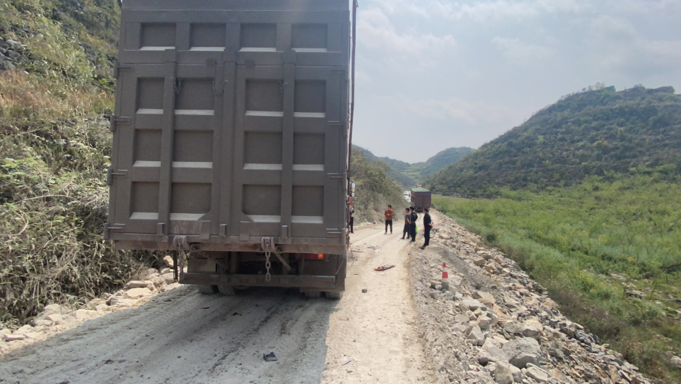 13时6分,贞丰县公安局交警大队接到群众报警称,在辖区陇燕山一砂石厂附近发生交通事故。接警后,值班民警迅速赶到现场,只见事故路段是一条长下坡的道路,两辆大货车相继40米左右的距离停在路上,其中一辆大货车靠在山体边,车头已经变形,前挡风玻璃碎裂,保险杠脱落;另一辆大货车的货箱门有明显损坏痕迹,两个门把手已经弯曲断掉。