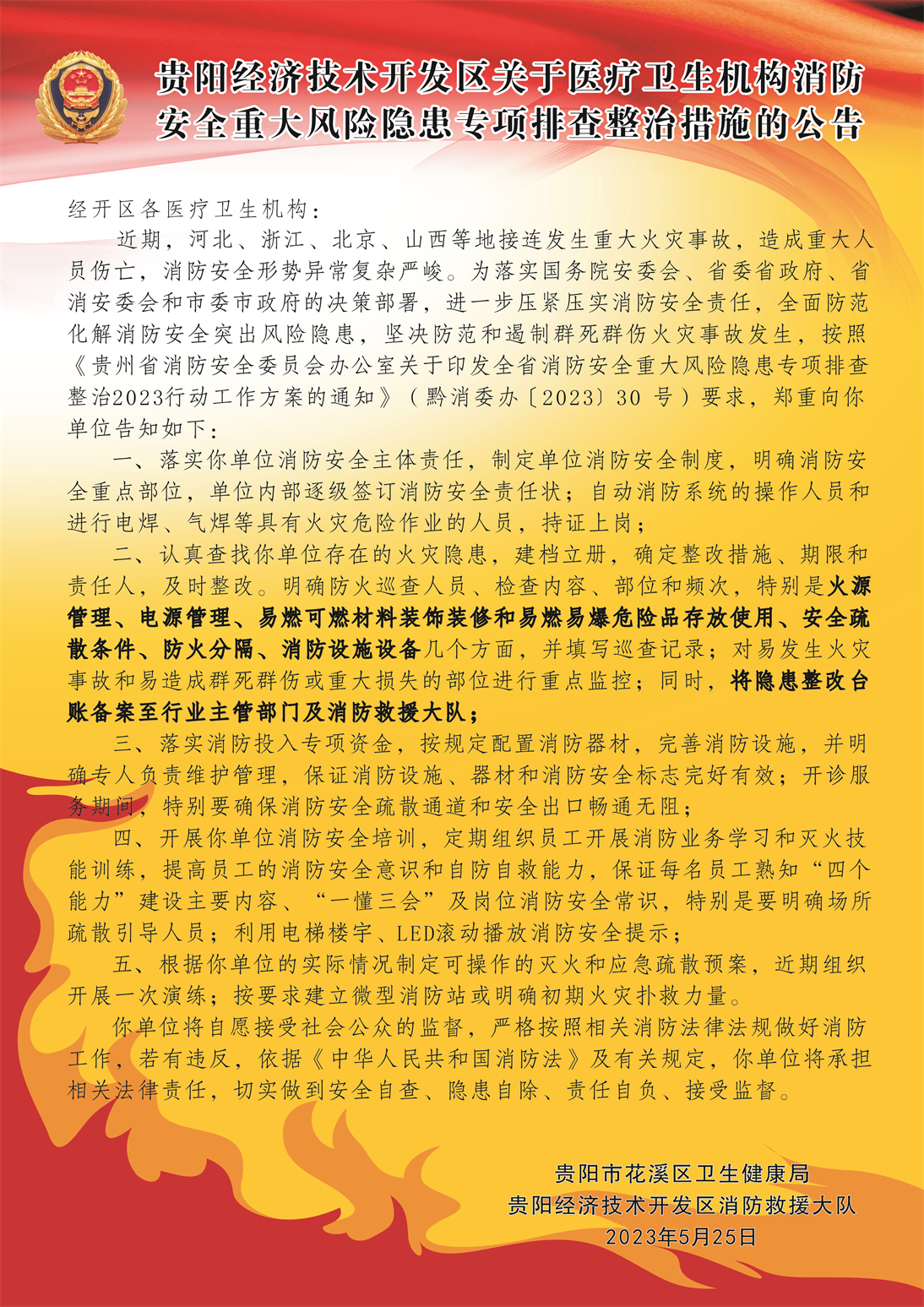 为扎实推进消防安全重大风险隐患排查整治2023行动,督导行业部门落实消防安全监管责任,近日,贵阳经济技术开发区消防救援大队联合经开区建管、花溪区教育局、花溪区卫健局等6个行业部门联合印发了《贵阳经济技术开发区关于开展消防安全重大风险隐患专项排查整治措施的公告》(以下简称“公告”),在全区范围内对各类重点场所进行全覆盖安全隐患排查整治。